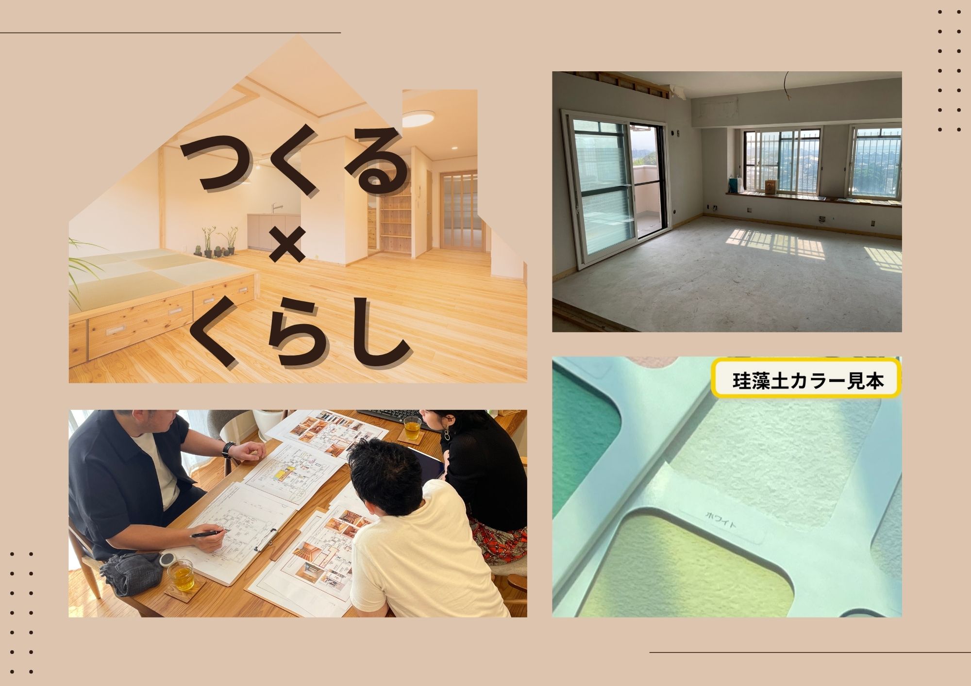 - リノベーション後物件: 完成した「つくらし」の空間を体験し、自然素材の心地よさや、お客様のこだわりが詰まった間取りを体感していただけます。