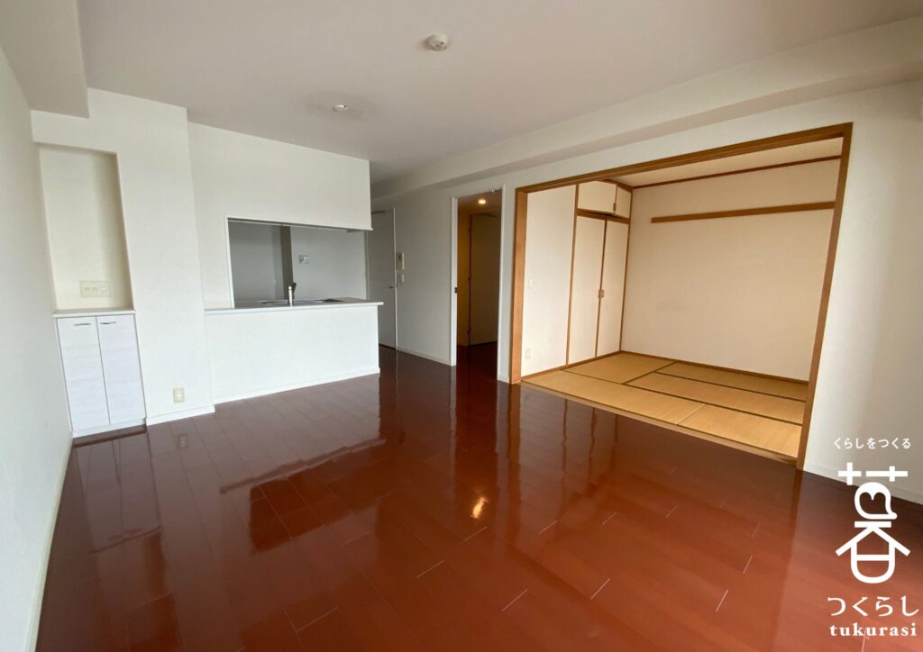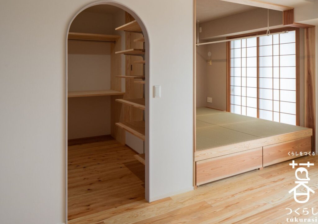 キッチンの垂れ壁や押入れ、襖の納まる壁を取り除き、和室は少し縮小した小上がり和室へ変更、2つあったリビングの入り口を1つへ変更して、縮小した和室の残りと廊下を使ってリビング内にウォークスルークローゼットを設置しました。