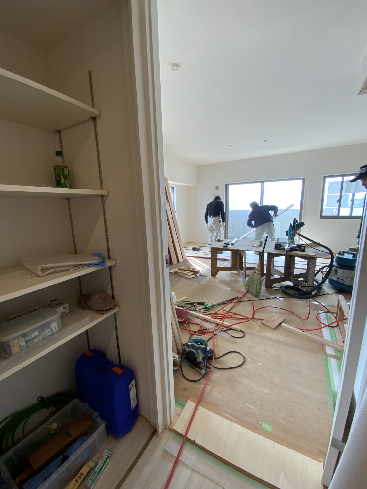 リビングでは、床に福岡県産耳納連山周辺の無垢の杉材が、一枚一枚丁寧に貼り始められていました♪