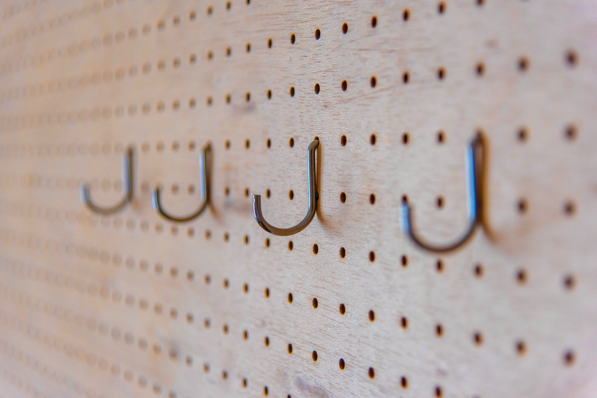壁に穴を開けたくない場所にも、有孔ボードがあれば気兼ねなくいろんな物を掛けたり差し込んだりできて便利です。