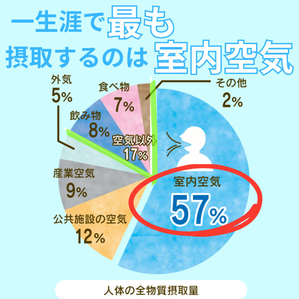 一生涯で、人間が摂取するもののうち83%は空気で、そのうち57%と最も摂取するのが室内空気なのです。