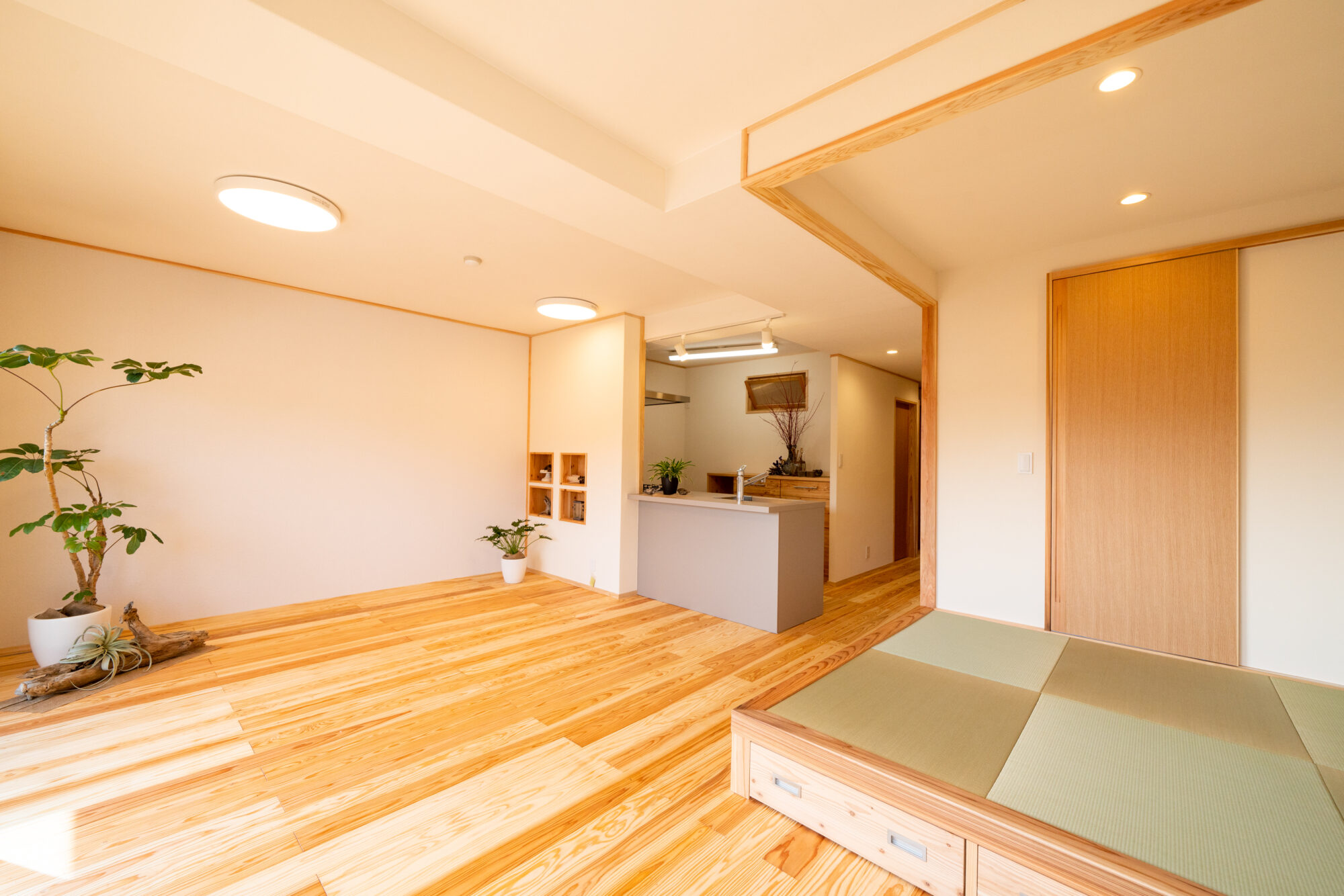 小上がり和室と洋室の2方向から出入りできる、つくらし仕様のウォークスルークローゼットは、光と風が通り過ぎるので、適度な換気で通気性が大変よく、家族の衣類が最適な環境で使いやすく収納できます。