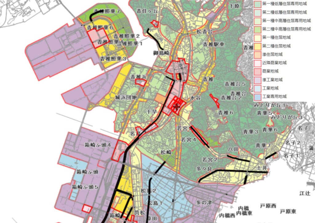 ▶千早駅を中心にした用途地域の分布図(福岡市Webマップ・都市計画情報より引用)