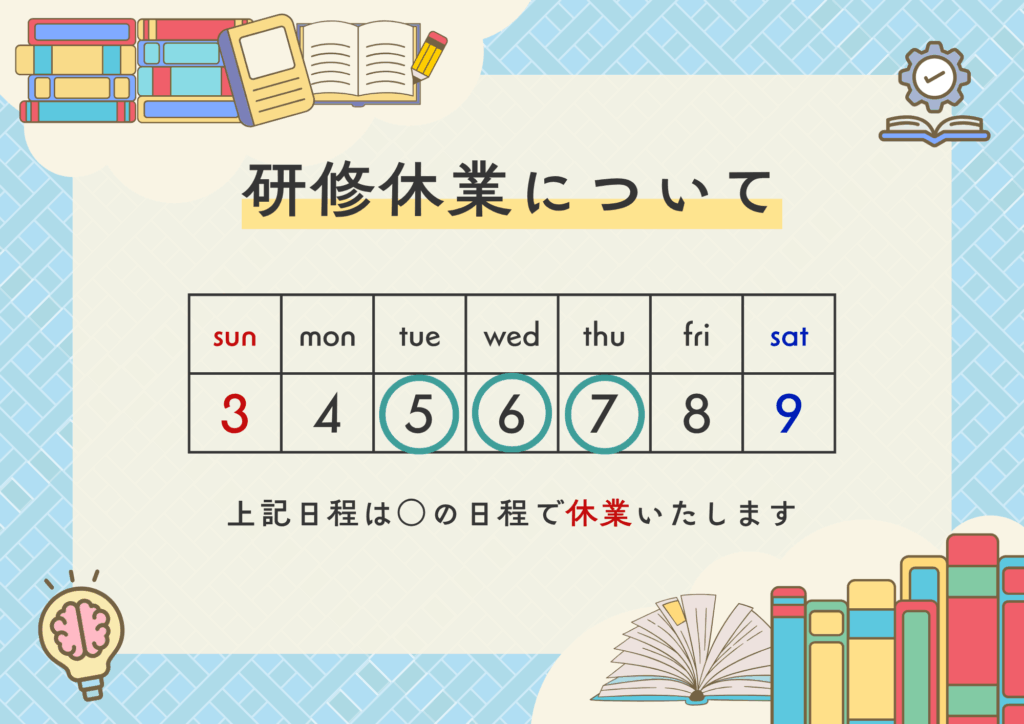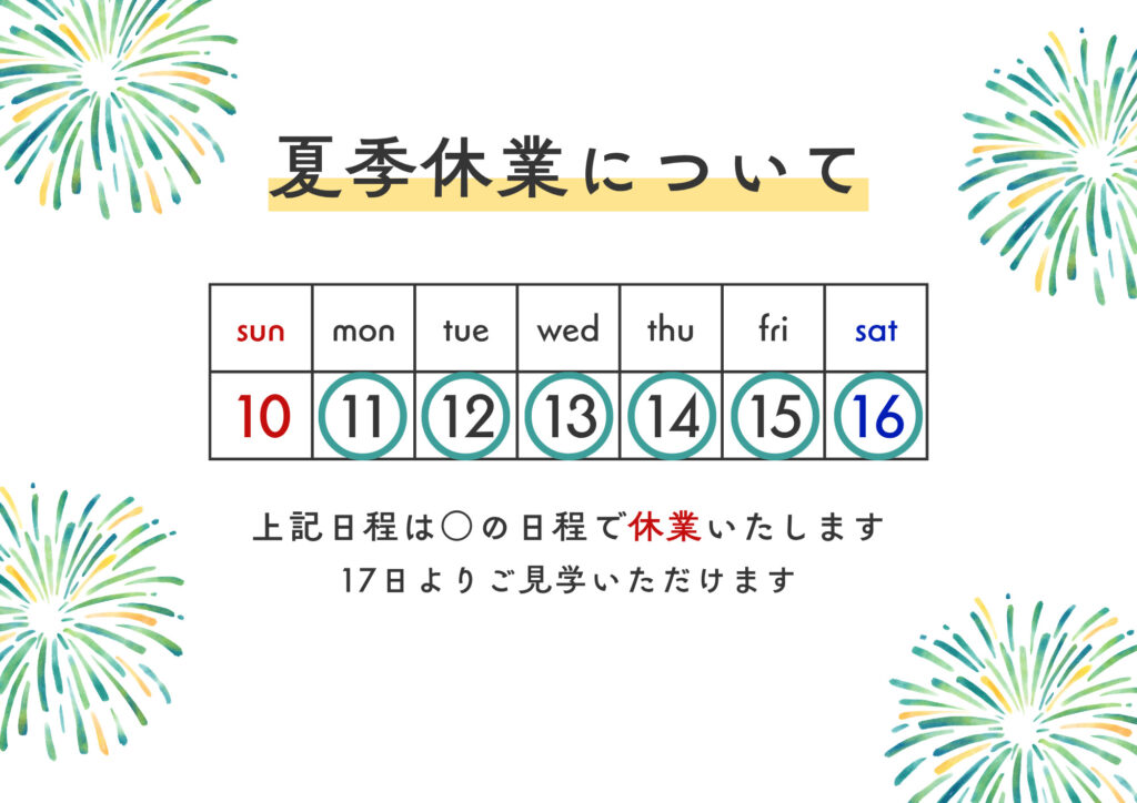 研修休業の翌週、8月17日(土)8月11日(月)~8月16日(土)まで夏季休業いたします。