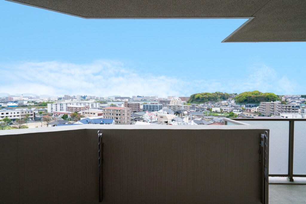 奥行き約2.5mのバルコニーが開放感を演出し、空を近く感じられ、多々良川を目の前に飛行機が降りて行く景色が心地よい天空の家「つくらし松崎08」。